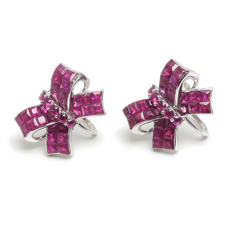 ルビーイヤリング K18WG リボンモチーフ